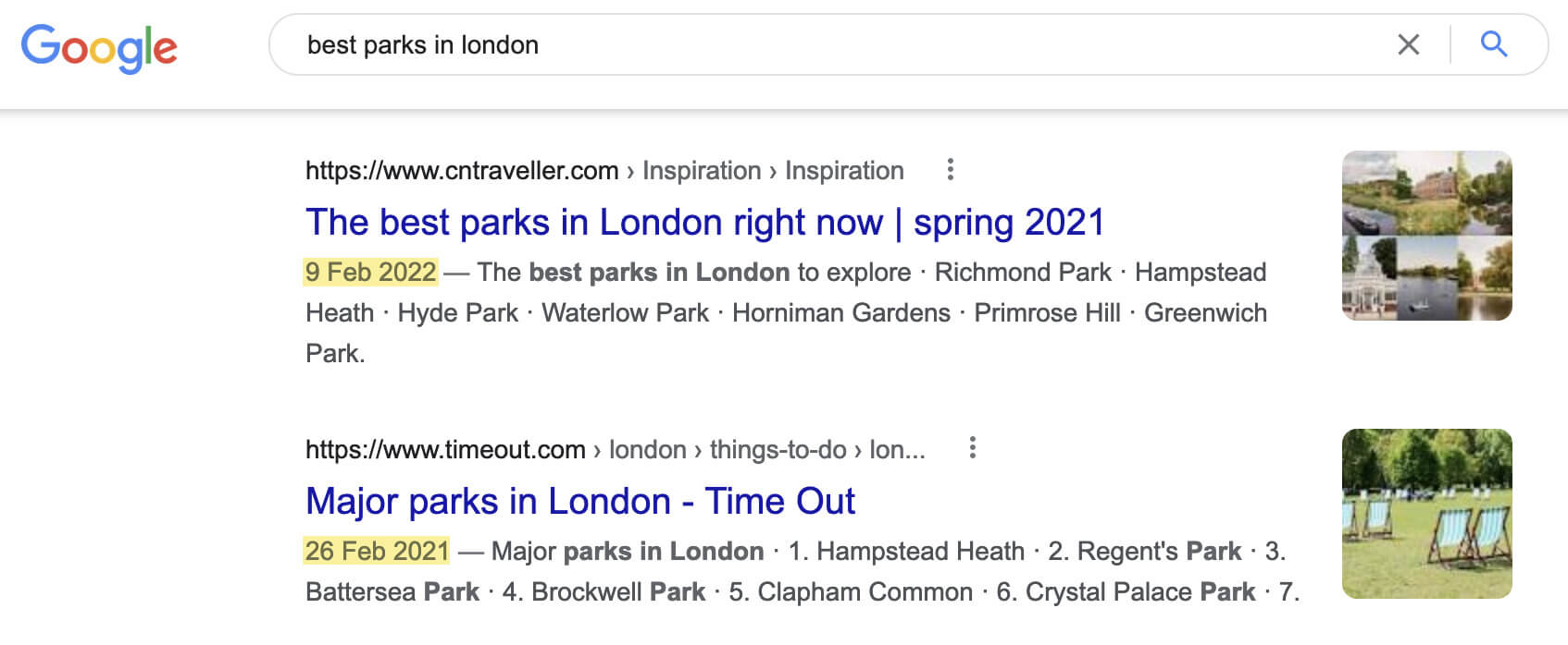 Google이 최신성을 중요하게 생각하는지 확실하지 않은 경우 최상위 페이지의 날짜를 확인하세요. 예를 들어, "최고의 헤드폰"에 대한 모든 상위 결과는 최근에 업데이트되었습니다. 그러나 "런던 최고의 공원"에 대한 상위 순위 결과는 몇 달 또는 몇 년 동안 업데이트되지 않았습니다. 매일 새로운 공원이 건설되는 것이 아니기 때문에 이것은 중요하지 않습니다.