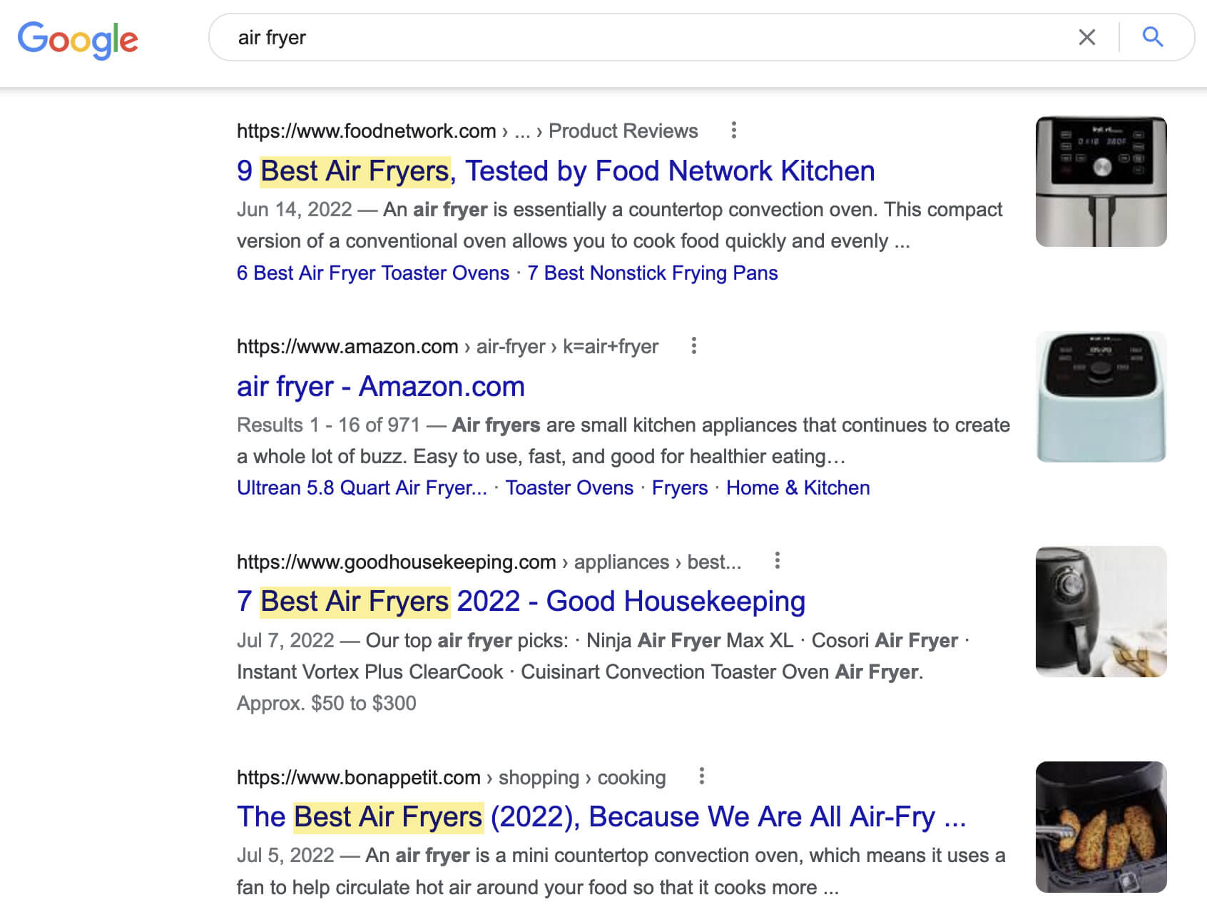 검색 의도는 검색어 이면의 '이유'입니다. 에어프라이어 상위 검색결과의 90%가 판매 페이지가 아닌 블로그 게시물인 이유도 바로 여기에 있습니다. Google은 검색자가 아직 구매할 준비가 되지 않았다는 것을 알고 있습니다. 그들은 제품을 비교하고 싶어합니다.