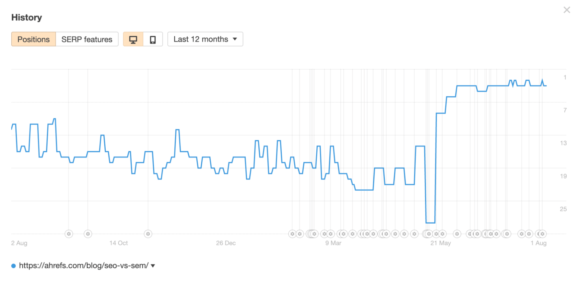 순위 추적은 Google에서 순위를 높이려는 노력이 효과가 있는지 알 수 있는 유일한 방법입니다. Google에서 검색하면 무료로 할 수 있지만 일반적으로 신뢰할 수는 없습니다. 이는 위치 및 검색 기록과 같은 요소가 페이지 순위가 표시되는 위치에 영향을 미칠 수 있기 때문입니다. Ahrefs의 Rank Tracker와 같은 순위 추적 도구를 사용하는 것이 훨씬 더 정확합니다. 이 도구에서는 10,000개의 키워드를 추적할 수 있지만 일반적으로 각 페이지의 주요 키워드만 추적하면 됩니다. 순위 추적기에서 키워드 옆에 있는 그래프 캐럿을 누르면 시간 경과에 따른 순위 진행 상황을 확인할 수 있습니다.