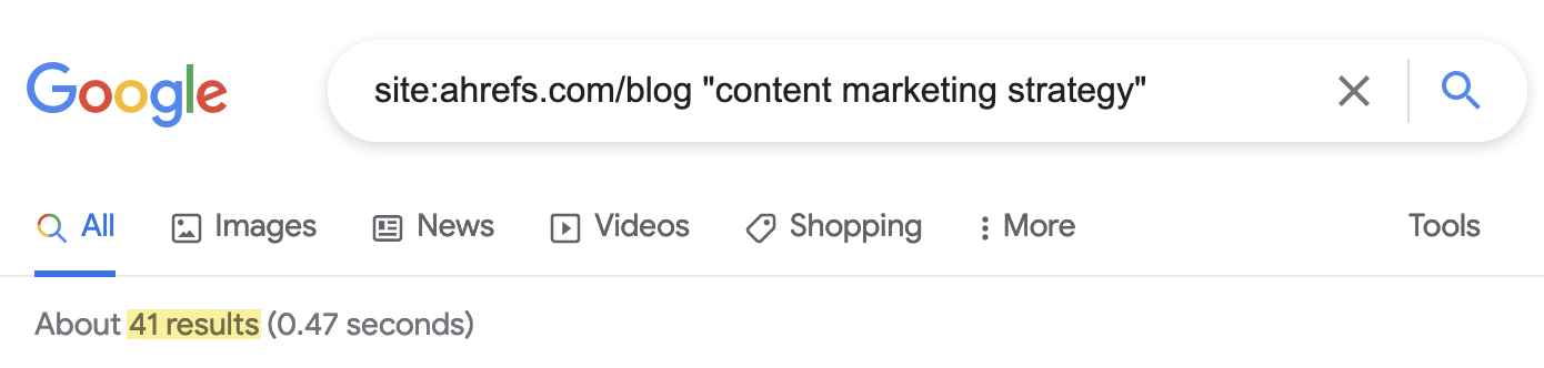 어느 쪽이든 site:domain.com "[키워드]"를 검색하여 Google에서 기회를 찾을 수 있습니다. 예를 들어, 우리 블로그에는 "콘텐츠 마케팅 전략"에 대한 언급이 많이 있습니다.