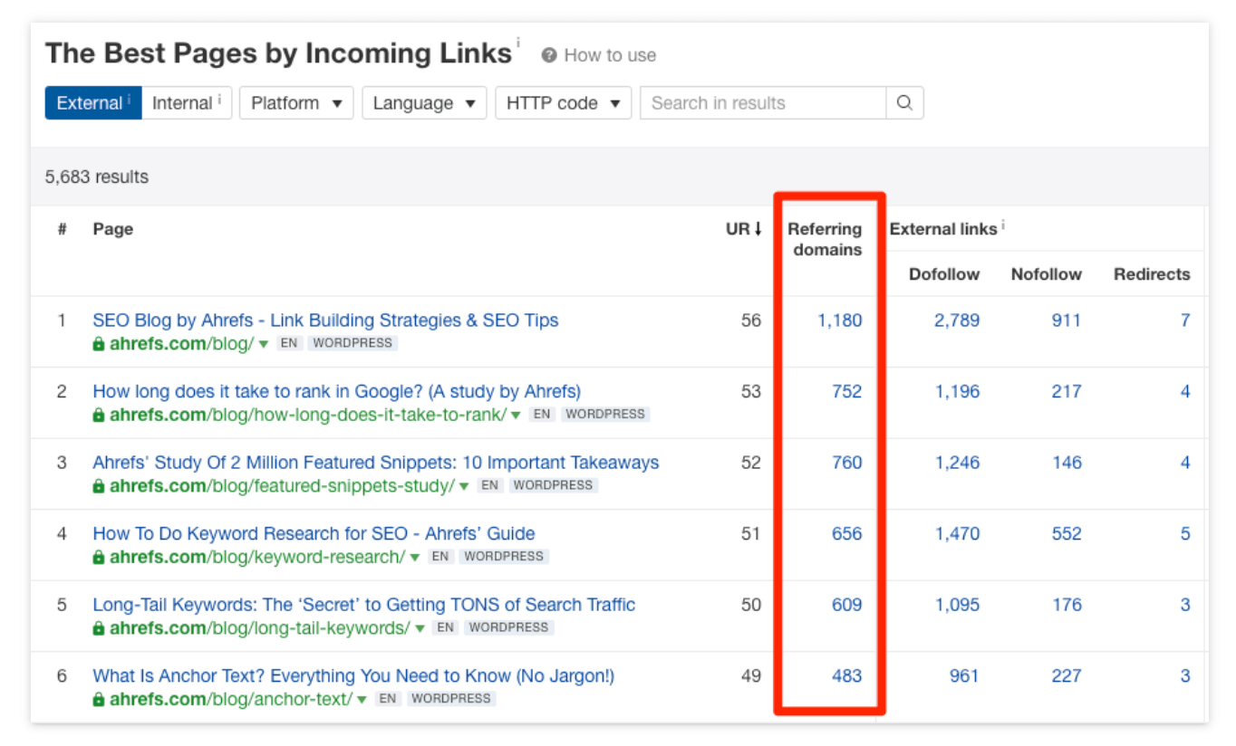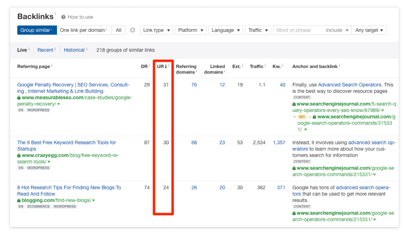 따라서 콘텐츠에 대한 백링크를 구축할 때 약한 페이지보다 강력한 페이지의 링크 구축을 우선시해야 합니다. Ahrefs Site Explorer에서 백링크 기회에 대해 경쟁 페이지를 분석하는 경우 이를 수행하는 가장 좋은 방법은 "백링크" 보고서의 UR 열을 보는 것입니다.
