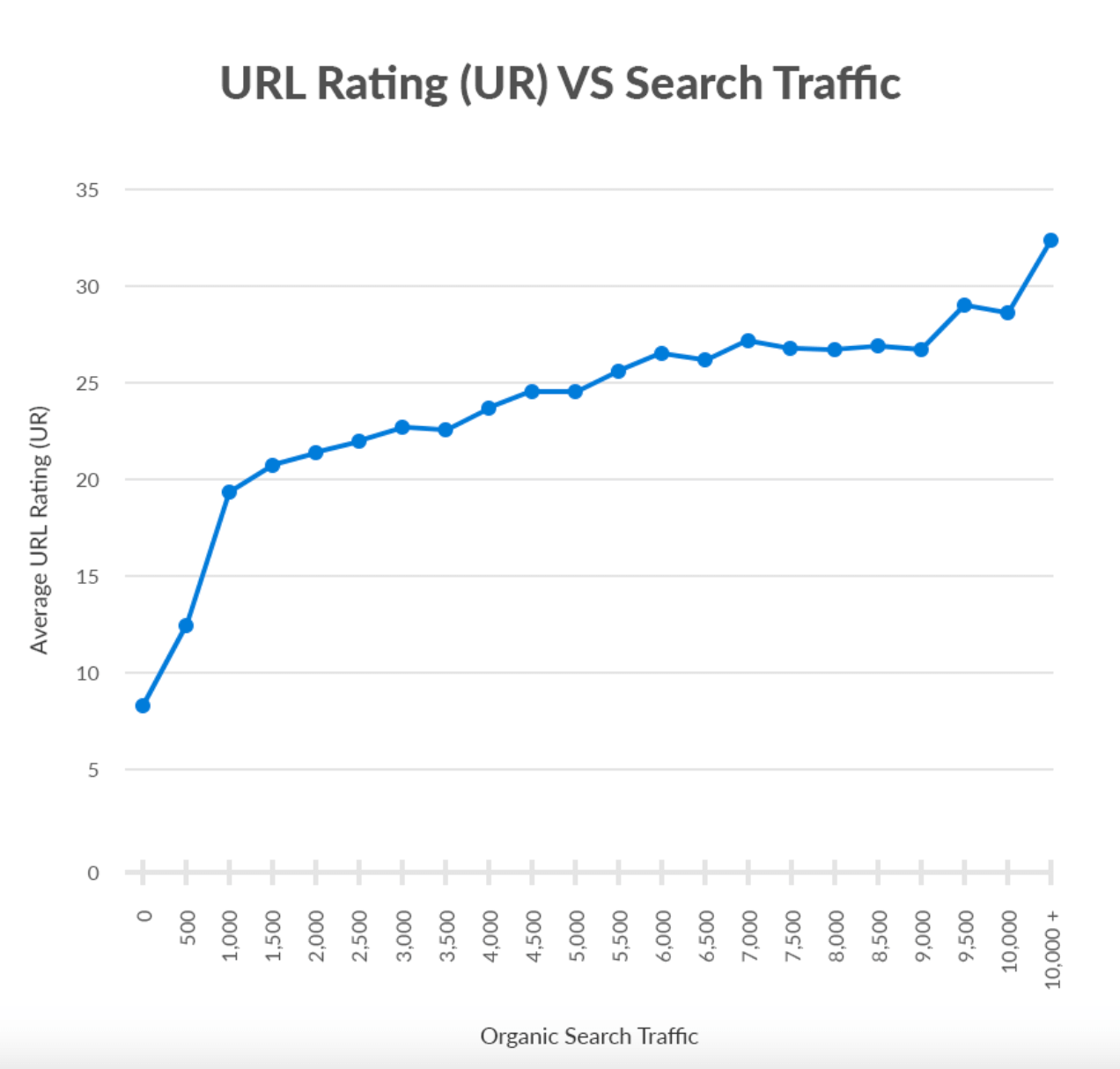 URL 등급은 0-100 범위에서 실행되며 웹페이지에 대한 백링크의 수량과 품질을 모두 고려합니다. UR과 자연 검색 트래픽 사이의 관계를 연구했을 때 우리는 분명한 긍정적인 상관 관계를 발견했습니다.