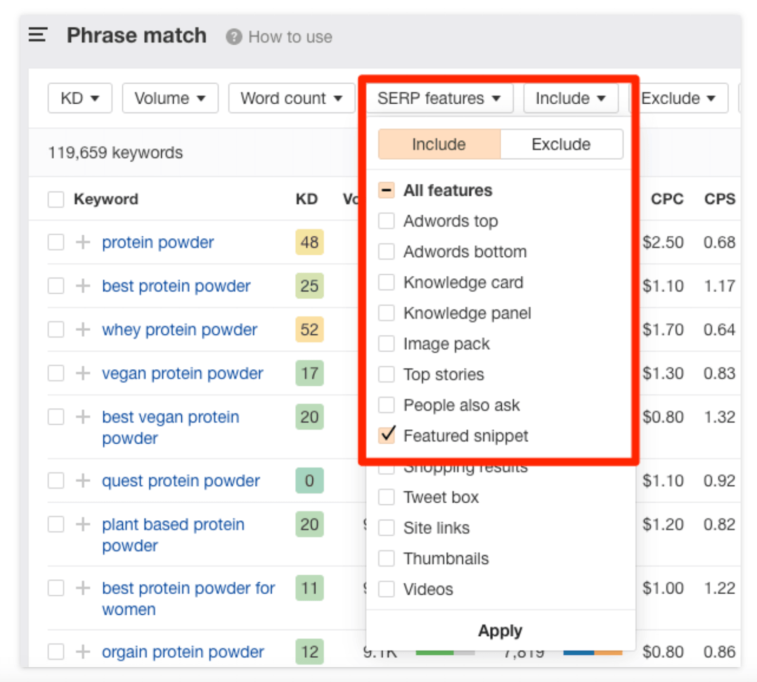 키워드 조사를 수행하는 경우 Ahrefs 키워드 탐색기에서 특정 SERP 기능이 있거나 없는 키워드를 필터링할 수 있습니다.