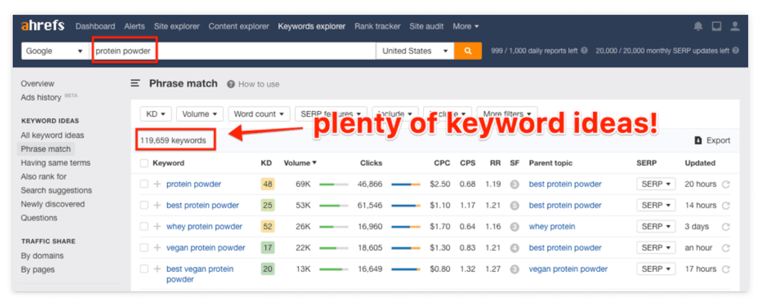 순위를 매기고 싶은 키워드를 찾는 것은 쉽습니다. Ahrefs 키워드 탐색기와 같은 키워드 조사 도구에 주제를 붙여넣은 다음 검색량과 관련된 키워드 아이디어를 찾으세요.
