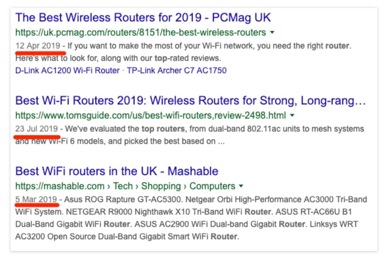 일반적으로 말해서, 대부분의 검색자가 귀하의 콘텐츠에 더 쉽게 접근할 수 있을수록 더 좋습니다. 신선도는 일부 검색에서 또 다른 중요한 요소입니다. 예를 들어, "최고의 라우터"를 Google에 검색하면 거의 모든 결과가 최근에 게시되었거나 다시 게시되었음을 알 수 있습니다.