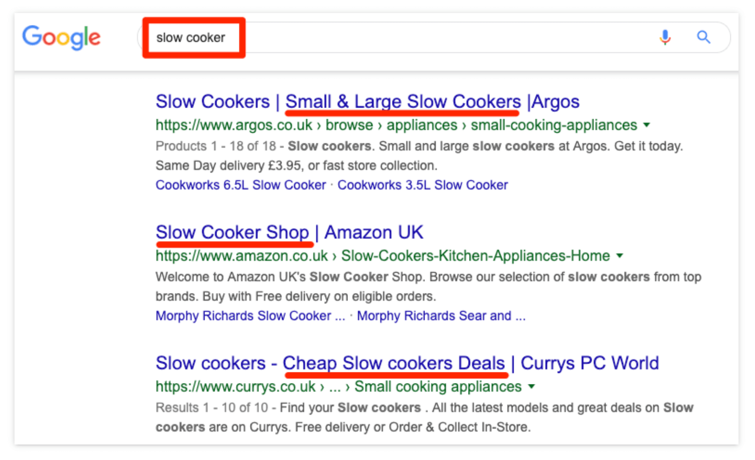 두 키워드의 유사성에도 불구하고 Google은 완전히 다른 두 가지 검색 결과 세트를 표시합니다. '슬로우 쿠커 레시피'의 경우 다양한 레시피가 나열된 페이지가 표시됩니다. '슬로우 쿠커'의 경우 제품 목록과 전자상거래 카테고리 페이지가 표시됩니다. Google은 검색어 이면의 동기를 해석하여 사용자가 보고 싶어하는 결과를 보여줍니다. 이것이 바로 검색 의도입니다. 최상위 페이지를 보고 '검색 의도의 3C'를 파악하기 위한 질문을 스스로에게 물어보세요.