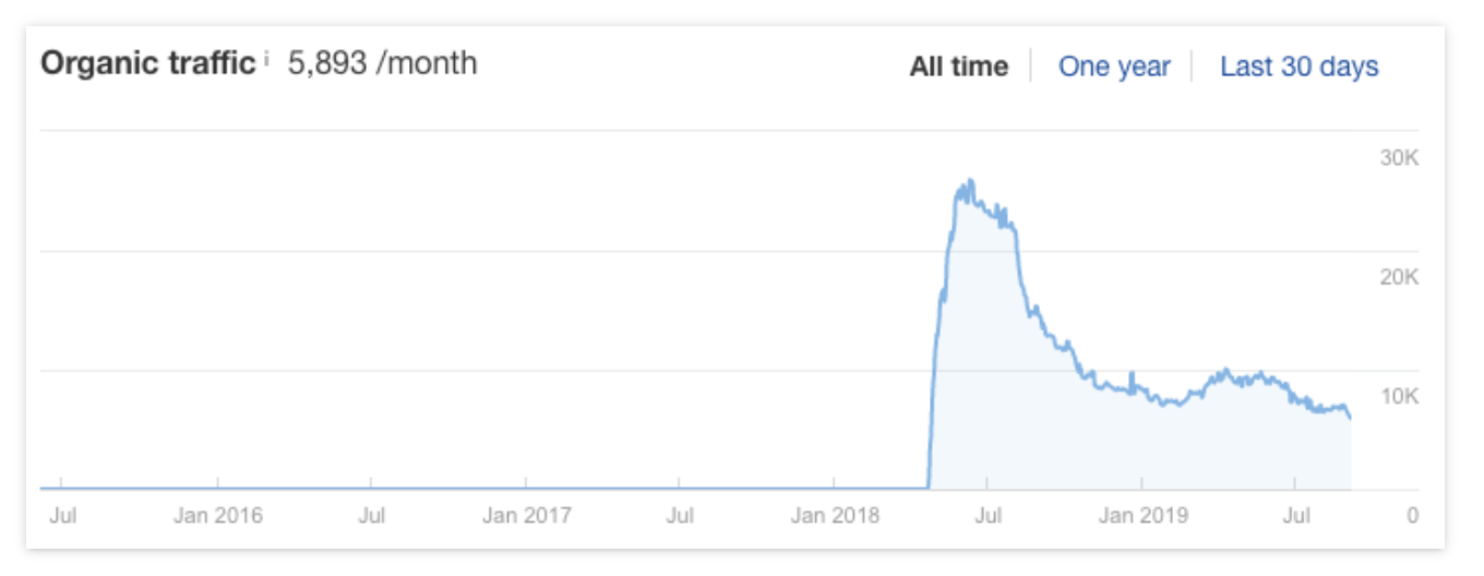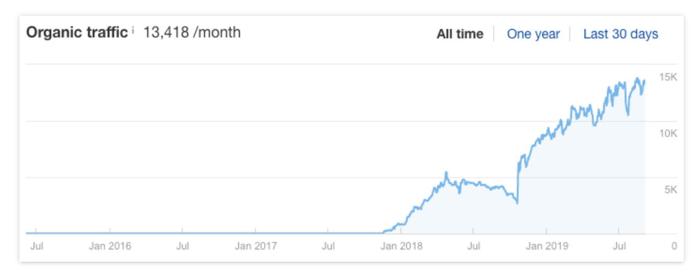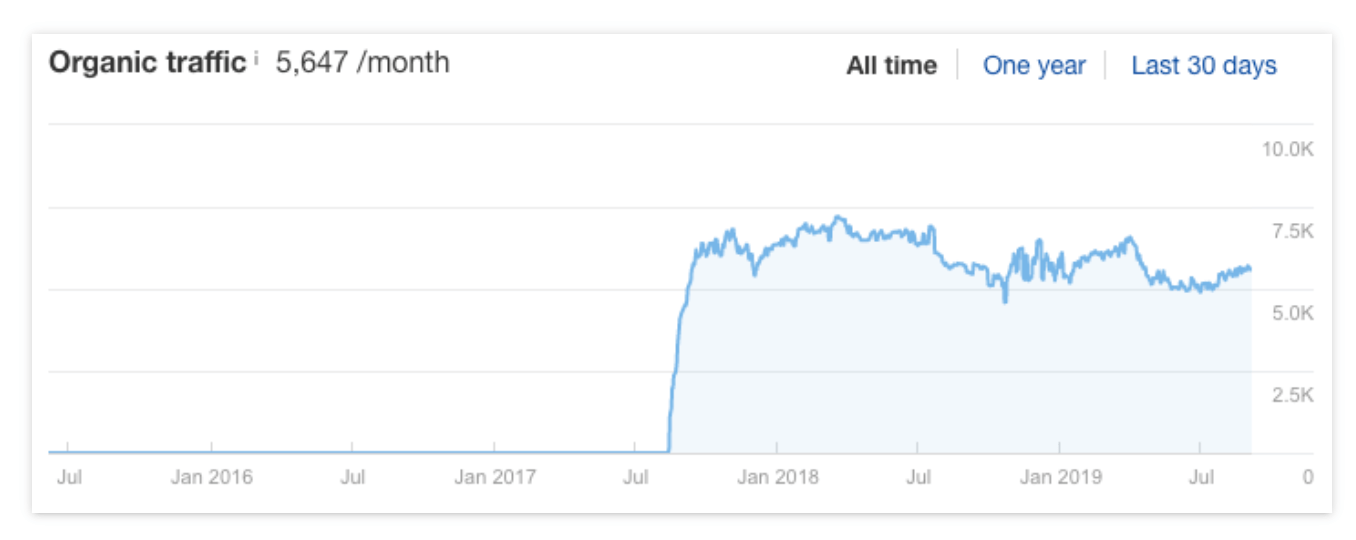 이러한 이유로 순위보다 유기적 트래픽에 더 많은 관심을 기울이는 것이 더 나은 경우가 많습니다. Google Analytics와 같은 분석 도구를 사용하여 이를 수행하거나 Ahrefs 사이트 탐색기에서 대략적인 추정치를 얻을 수 있습니다. URL을 붙여넣은 다음 '개요' 보고서의 '자연 트래픽' 탭으로 이동하세요. 사이트의 중요한 페이지에 대해 보고 싶은 것은 다음과 같은 그래프입니다.