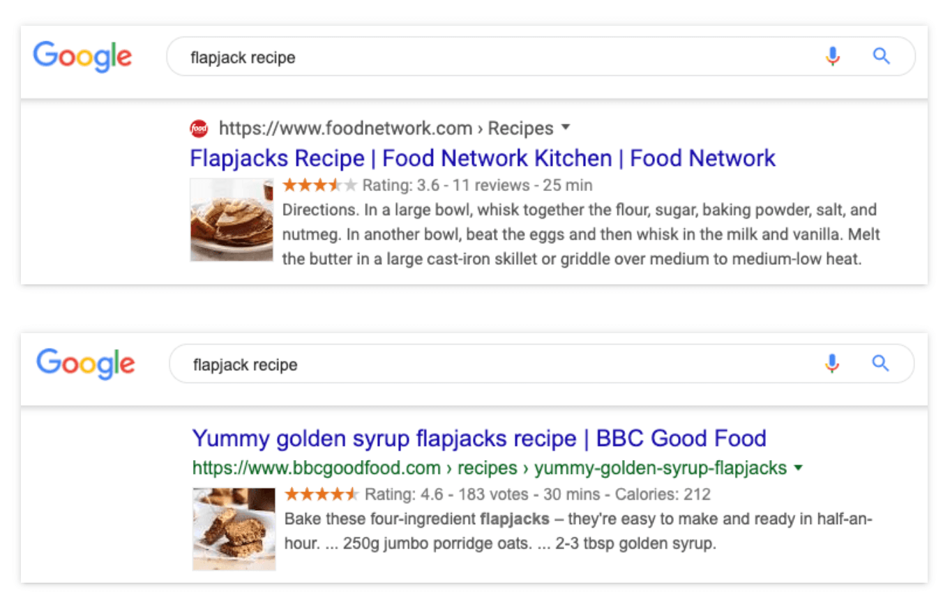 Google은 위치, 과거 검색 기록, 검색 설정과 같은 요소를 검토하여 "그 순간에 가장 유용하고 관련성이 높은 결과를 맞춤화"합니다.즉, 귀하의 사이트가 귀하의 타겟 키워드에 대해 1위를 차지하더라도 항상 모든 사람에게 해당되는 것은 아닐 수도 있습니다. 예를 들어 영국과 미국에서 '플랩잭 레시피'를 검색하면 결과가 다릅니다.