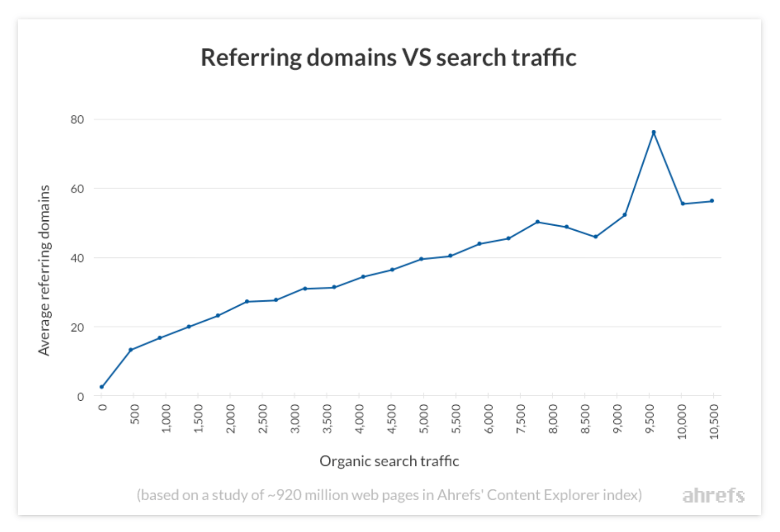 Google의 순위 알고리즘은 PageRank라는 것을 기반으로 합니다. 간단히 말해서 이는 백링크를 투표로 해석합니다. 일반적으로 더 많은 표를 얻은 페이지가 더 높은 순위를 차지하는 경향이 있습니다. 작년에 우리는 거의 10억 개의 웹페이지를 연구한 결과 참조 도메인(고유 웹사이트의 링크)과 자연 검색 트래픽 사이의 명확한 상관관계를 발견했습니다.