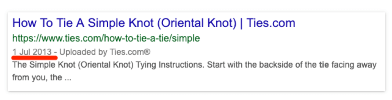6년이 넘도록 누구도 페이지를 업데이트하지 않았지만 넥타이를 매는 방식은 그때나 지금이나 똑같기 때문에 상관없다. 신선함이 중요한 순위 요소로 보이는지 알아보려면 타겟 키워드에 대한 검색 결과를 살펴보세요. 적절하게 전략을 조정하세요.