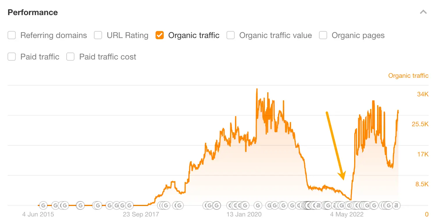 Ahrefs에서는 분기마다 콘텐츠 감사를 수행합니다. 그러한 감사 중 하나에서 나는 무료 SEO 도구에 대한 우리 게시물의 유기적 트래픽이 감소하고 있음을 발견했습니다. 그래서 업데이트했습니다. 그리고 교통량이 급증했습니다.